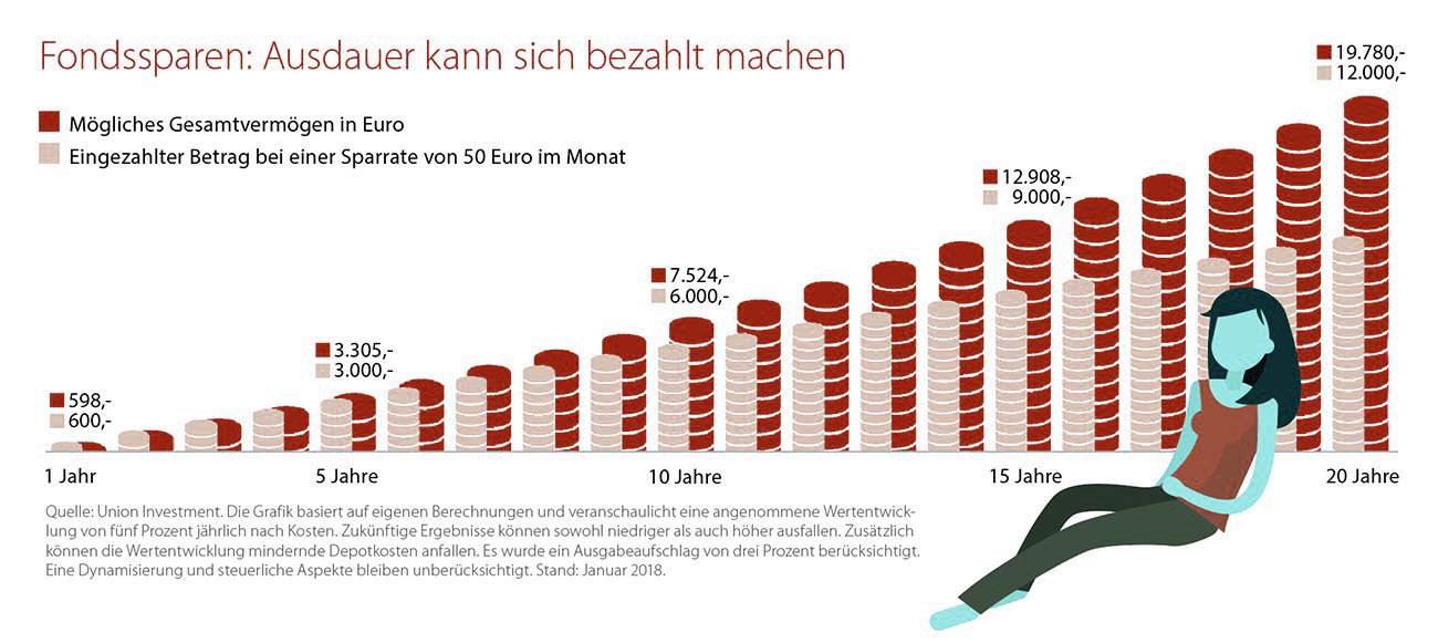 Warten Sie nicht auf fallende Kurse und spekulieren auf den perfekten Einstiegsmoment. Den wenigsten gelingt der Einstieg bei tiefen Märkten und Ausstieg am Kurshoch. Denken Sie langfristig und machen Sie sich weniger von kurzfristigen Schwankungen der Börsen abhängig. Beim Fondssparen legen sie regelmäßig einen vorher festgelegten Betrag an. Rechnerisch erwerben Sie bei fallenden Kursen mehr Fondsanteile als bei hohen Kursen.